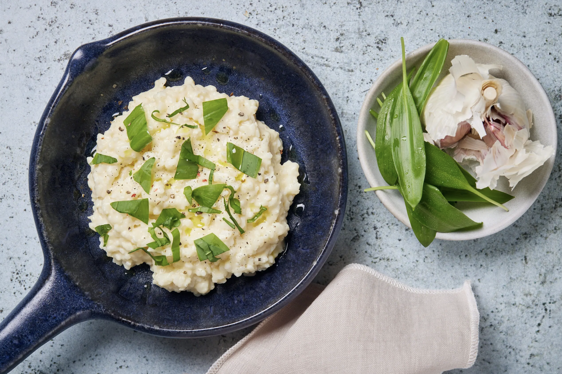 2. Vacherin Fribourgeois AOP grob reiben und zusammen mit der Sahne ins Risotto geben. Rühren, bis sich der Käse aufgelöst hat. Mit Salz und Pfeffer abschmecken. Nach Belieben mit gehacktem Bärlauch dekorieren und heiß servieren.