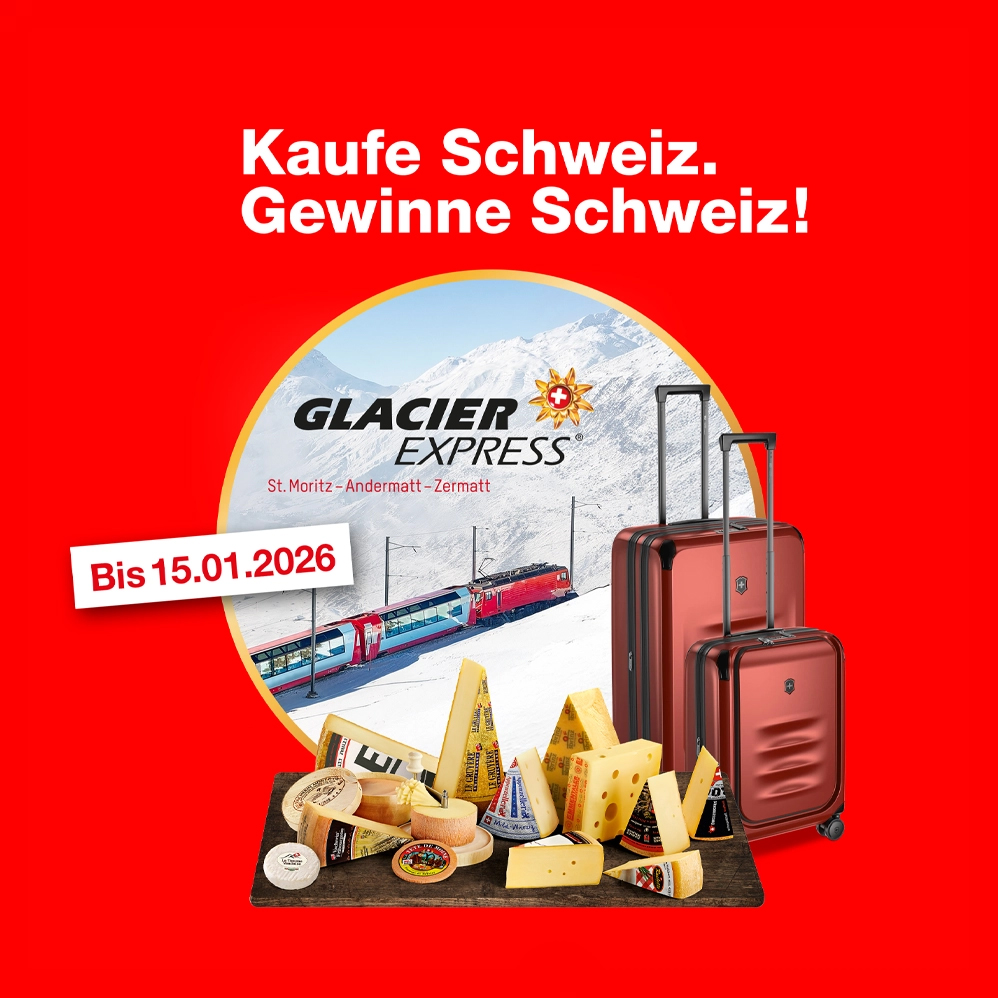 Schweizer Käse verlost exklusiv unter dem teilnehmenden Thekenpersonal ebenfalls eine Reise für 2 Personen in die Schweiz: mit Glacier Express Tour von St. Moritz nach Zermatt. Inkl. 2 Übernachtungen mit Frühstück in den oben genannten Komfort-Hotel sowie An- und Abreise mit der Deutschen Bahn in der 1. Klasse oder mit der Swiss International Airlines in der Economy Class – je nachdem, welches Verkehrsmittel sich bezüglich des Wohnortes des Gewinners anbietet. Die Schweiz-Reise hat einen Gesamtwert von ca. 3.000 €.